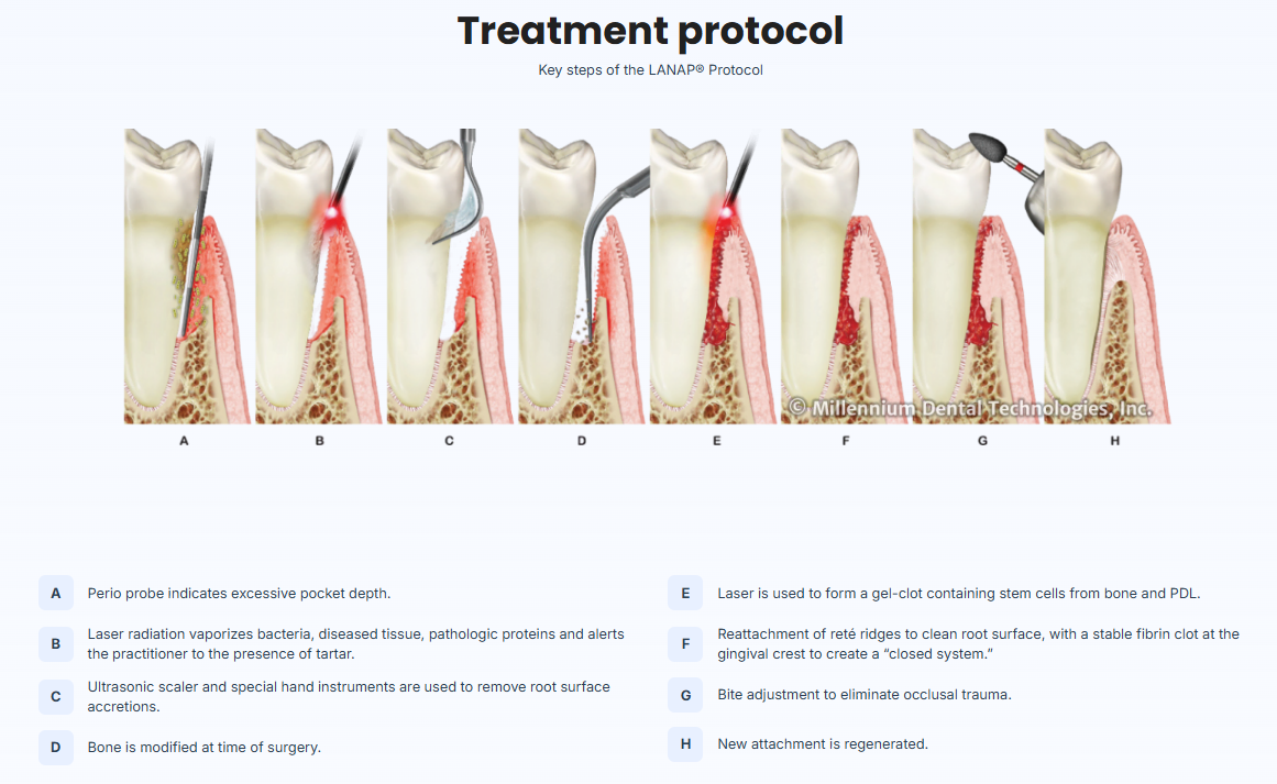 The LANAP® Protocol is the world’s first and only FDA clearance for true periodontal regeneration based on human histologic studies using the PerioLase® MVP-7™, a free-running pulsed Nd:YAG laser.